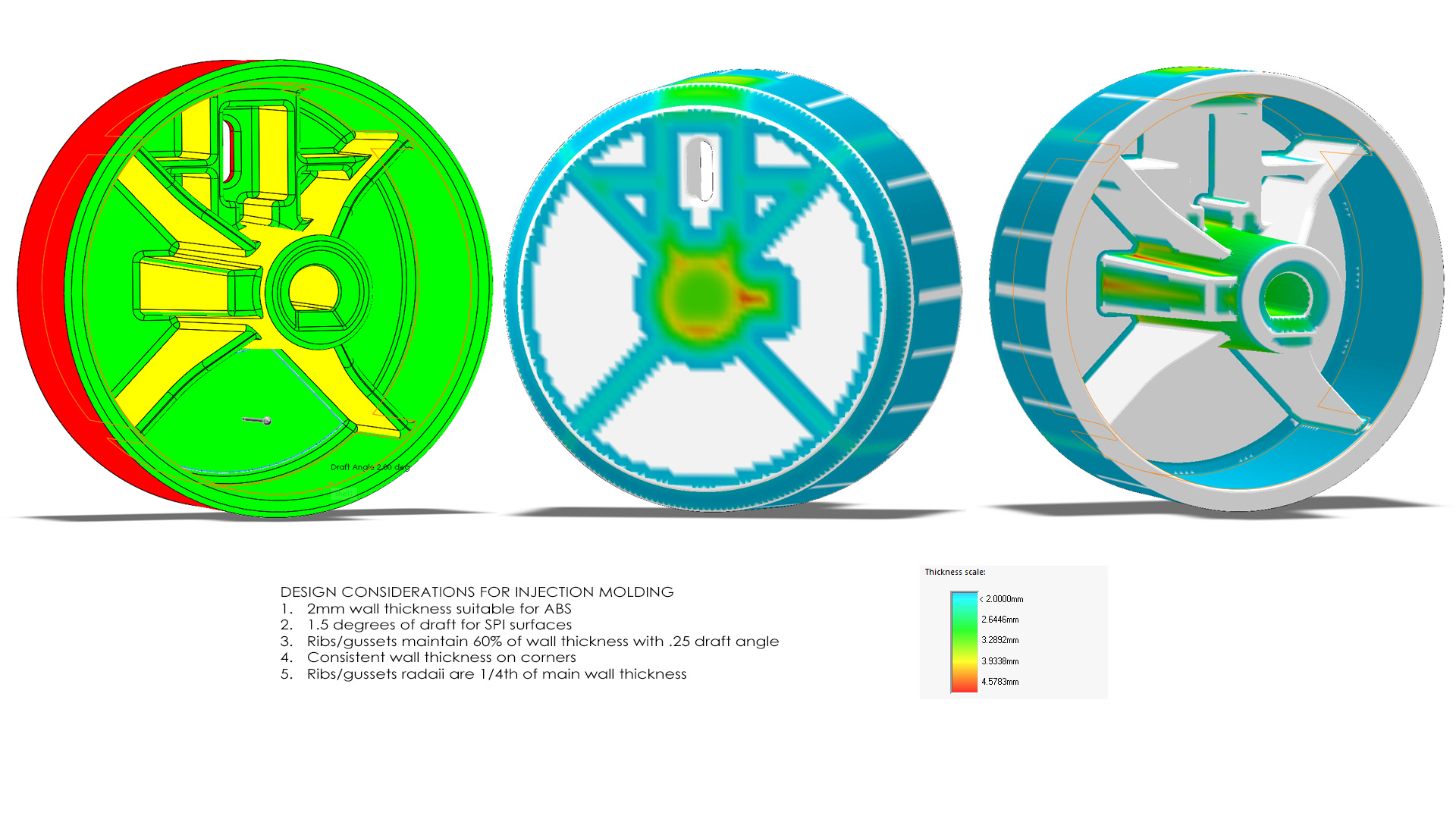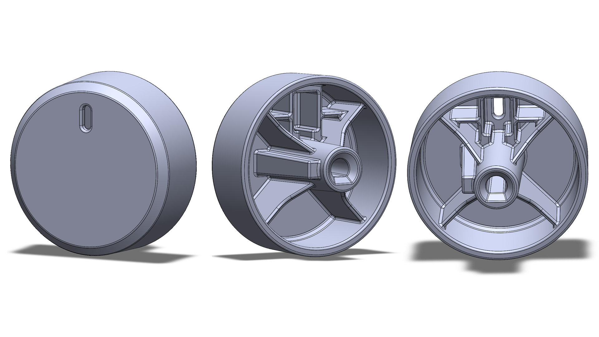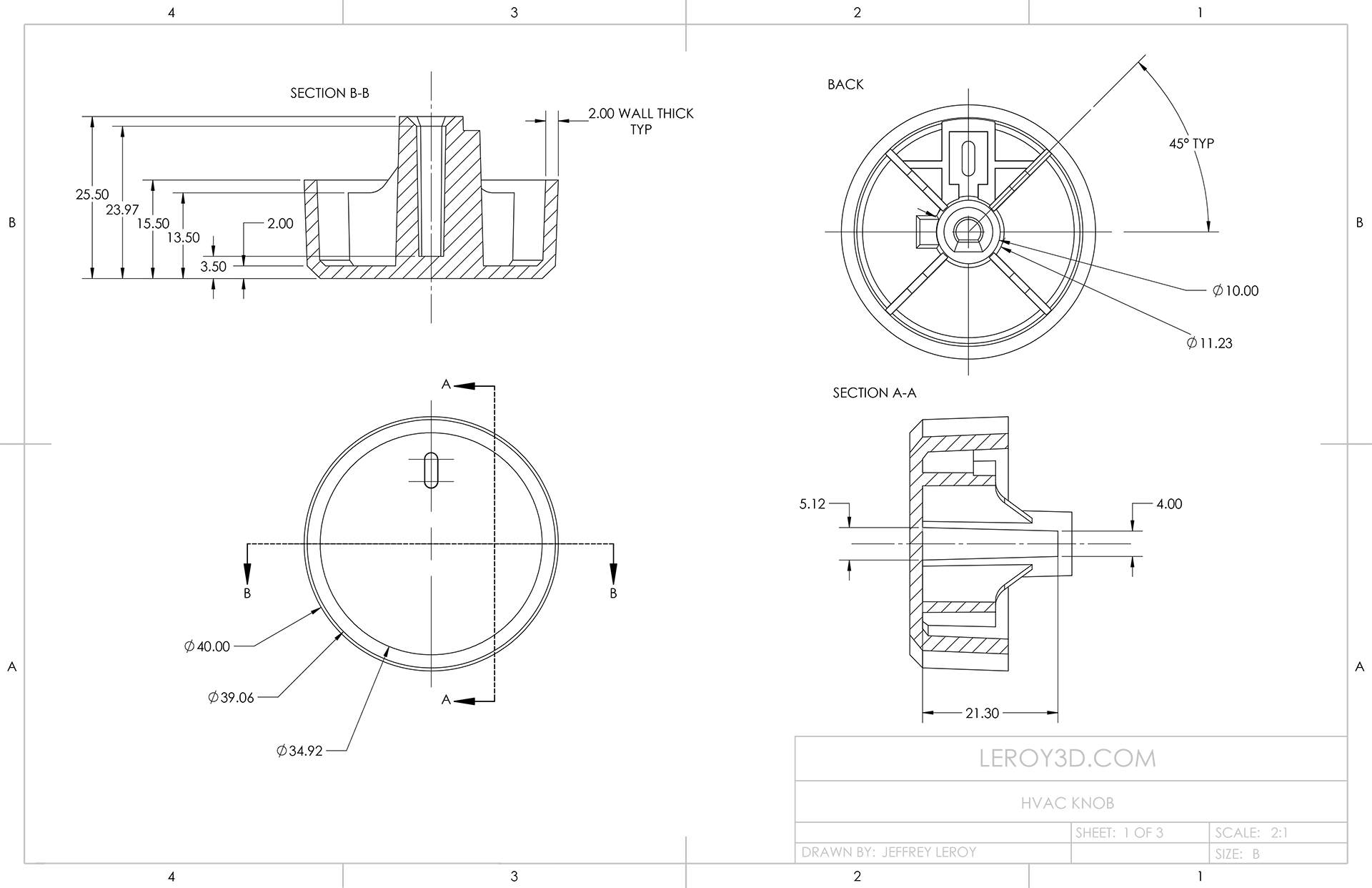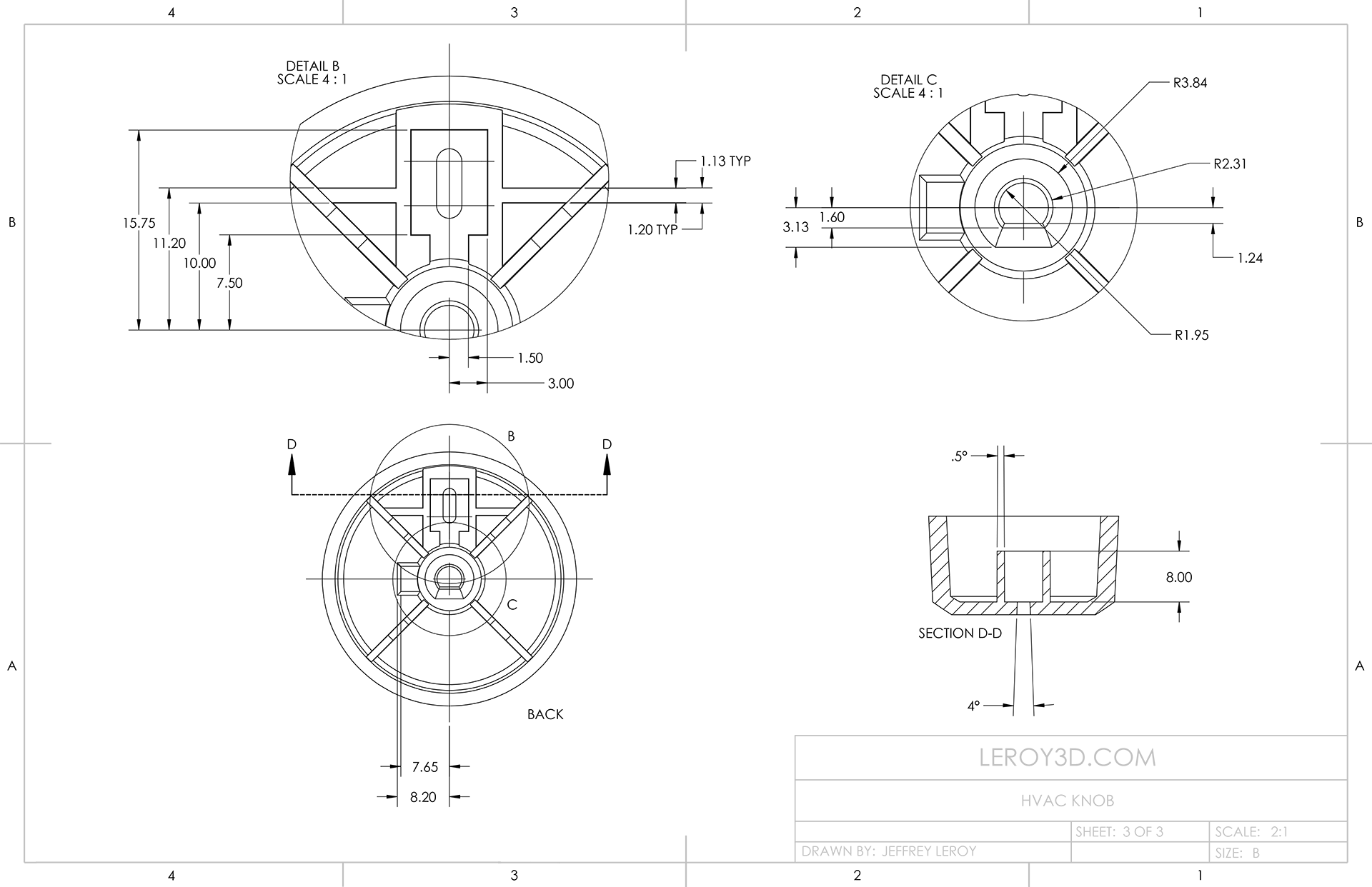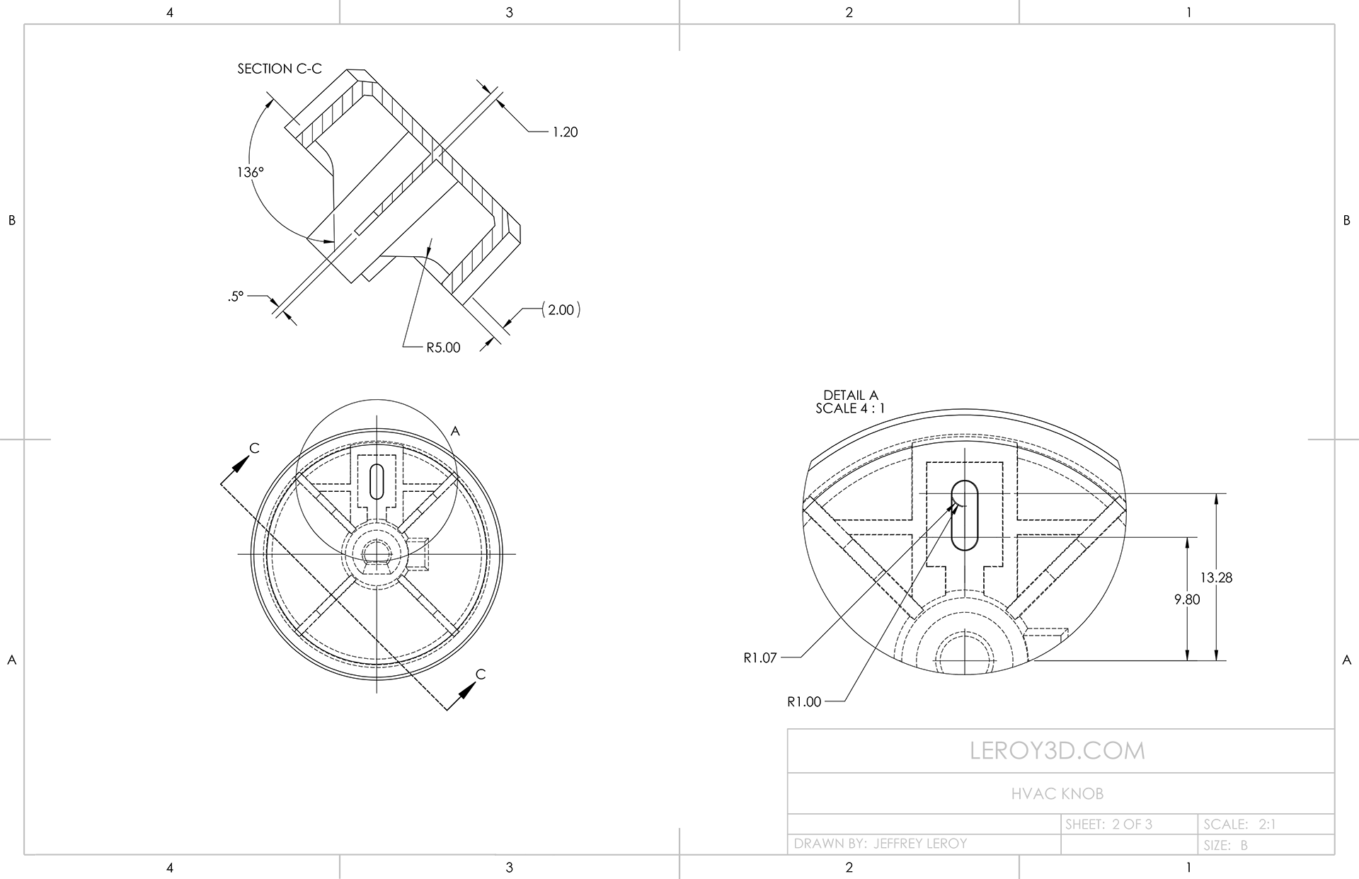 an HVAC Knob designed for injection molding, 2D drawings and 3D model created in Solidworks.