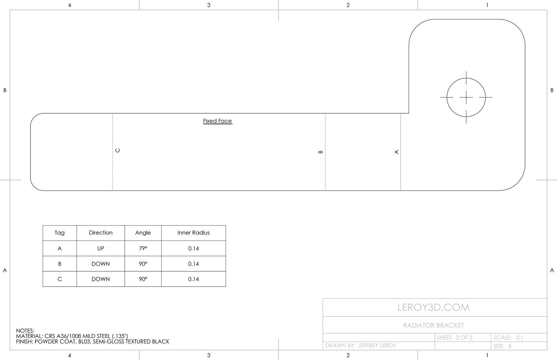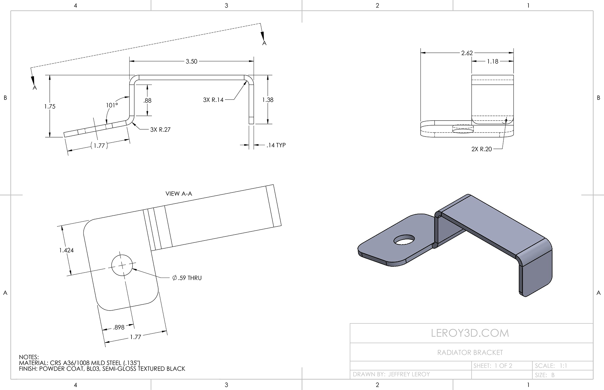 a radiator bracket that i designed to accomodate an oversized radiator. 2d drawings and 3D sheet metal model created in solidworks.